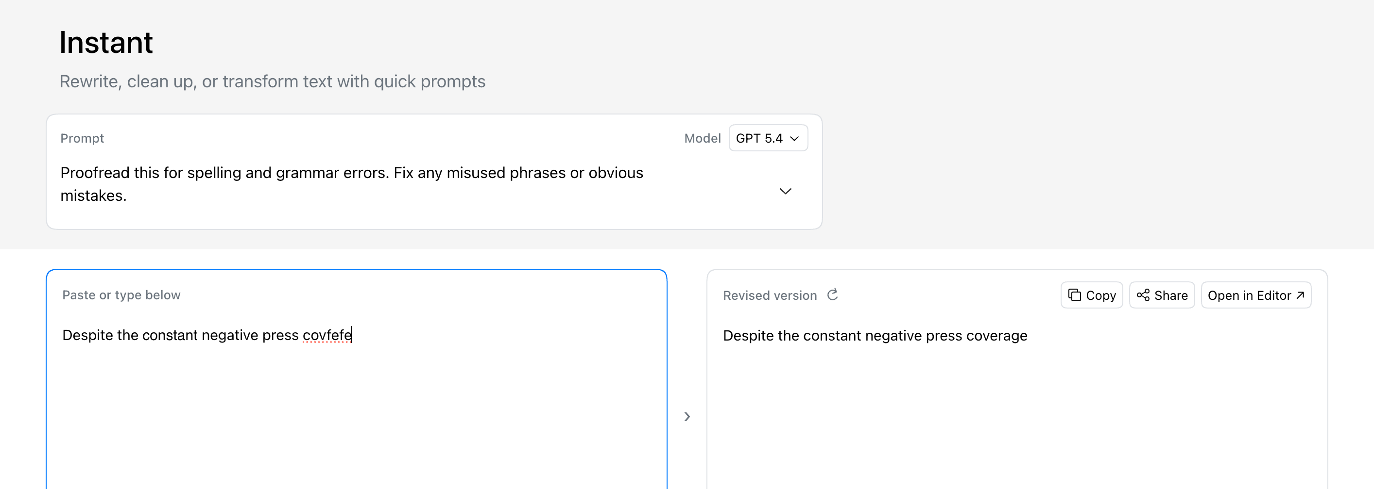 Instant is faster and uses much less of your monthly limit than the full editor. It's perfect for polishing emails, notes, marketing copy, or other shorter text samples. Instant can be much more efficient for simple repetitive workflows.